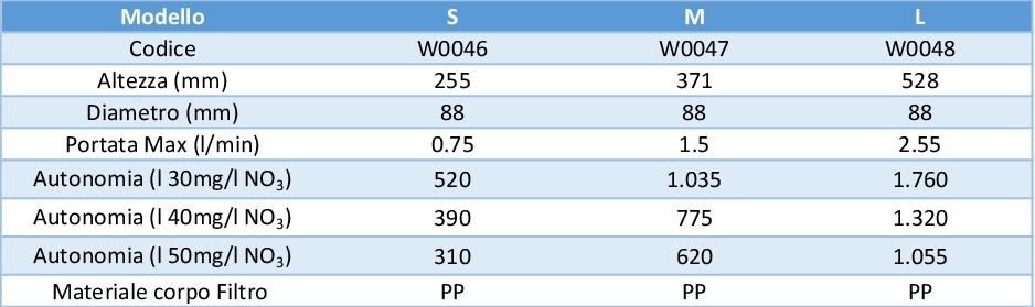 OCEANO Anti nitrates, è costituito da una colonna di resine a scambio ionico caratterizzate da una eccezionale selettività nei confronti dei nitrati e da un modulo per il trattenimento delle resine ed eventuali microparticelle in sospensione. La resina utilizzata, anionica fortemente basica, è caratterizzata da una struttura porosa che permette un ottimo scambio cinetico, un’alta resistenza agli shocks fisici, termici e osmotici, nonché al fouling organico. La sua composizione è conforme alle norme vigenti che regolamentano i processi di trasformazione alimentare. Disponibili nella versione con attacco “Bayo” e “Stem”.