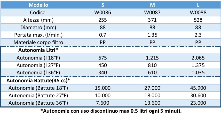La doppia alimentazione (solo versioni S, M e L), gestita da un by-pass interno a taratura fissa (15%), è capace di alimentare contemporaneamente, in una percentuale prestabilita, sia le resine che il carbone attivo con il conseguente aumento dell’autonomia dell’apparecchio ed un controllato e non eccessivo abbattimento della durezza dell’acqua. La cartuccia è dotata di attacchi In/Out con codoli Ø mm 10. Le versioni S/M/L sono composte da Resine carbossiliche tamponate + Carbone Attivo Granulare GAC mentre le versioni X/XL/XXL sono composte da Resine carbossiliche tamponate + Carbon Block 0,5µm.