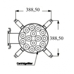 Contenitori multi cartuccia in acciaio inox AISI 316L da 15 elementi, muniti di zampe di sostegno, con apertura superiore flangiata, attacchi ingresso/uscita flangiati DN100, 2 attacchi filettati da ½” BSP per lo sfiato aria e presa di pressione;
