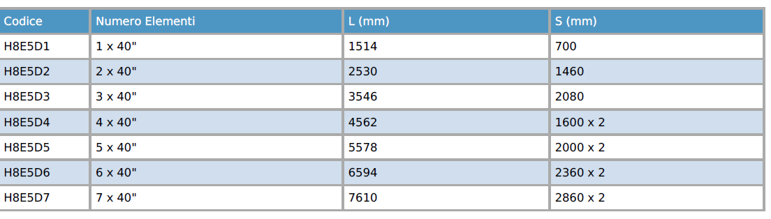 - Completi di staffe di fissaggio e selle (n.2 pezzi da 1 a 3 elementi, n.3 pezzi da 4 a 7 elementi);