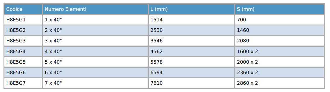 - Completi di staffe di fissaggio e selle (n.2 pezzi da 1 a 3 elementi, n.3 pezzi da 4 a 7 elementi);